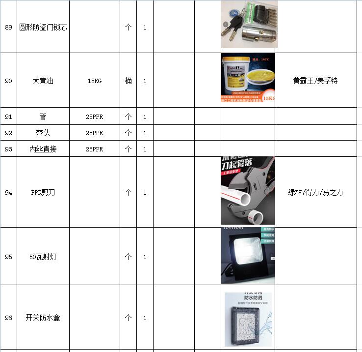 (5)采購(gòu)內(nèi)容:威海建城物業(yè)物資定點(diǎn)采購(gòu),主要包括五金、水暖管件、保潔、維修、綠化所需物資、應(yīng)急維修的其他物資等,采購(gòu)清單詳見附件。